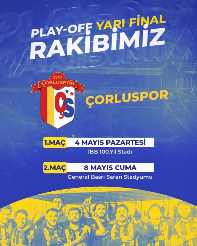 Play-Off yarı finalinde Küçükçekmece Sinopspor’un rakibi Çorluspor 1947 oldu; kritik eşleşmenin ilk maçı 4 Mayıs’ta İstanbul’da, rövanşı ise 8 Mayıs’ta Çorlu’da oynanacak.