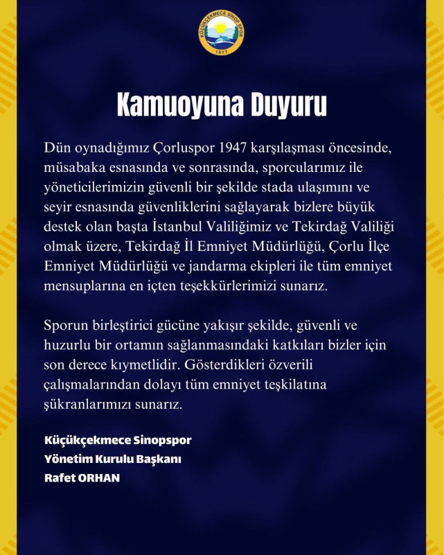 Başkan Orhan açıklamasında, “Dün oynadığımız Çorluspor 1947 karşılaşması öncesinde, müsabaka esnasında ve sonrasında sporcularımız ile yöneticilerimizin güvenli bir şekilde stada ulaşımını ve seyir esnasında güvenliklerini sağlayarak bizlere büyük destek olan başta İstanbul Valiliğimiz ve Tekirdağ Valiliği olmak üzere, Tekirdağ İl Emniyet Müdürlüğü, Çorlu İlçe Emniyet Müdürlüğü ve jandarma ekipleri ile tüm emniyet mensuplarına en içten teşekkürlerimizi sunarız” ifadelerine yer verdi.