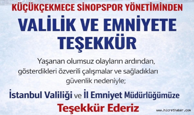 Bölgesel Amatör Lig’de mücadele eden Küçükçekmece Sinopspor, Çorluspor 1947 ile oynanan karşılaşmanın ardından kamuoyuna önemli bir teşekkür mesajı yayımladı. Kulüp Başkanı Rafet Orhan imzasıyla yapılan açıklamada, maç öncesi, maç esnası ve sonrasında takımın güvenliğini sağlayan emniyet güçlerine teşekkür edildi.