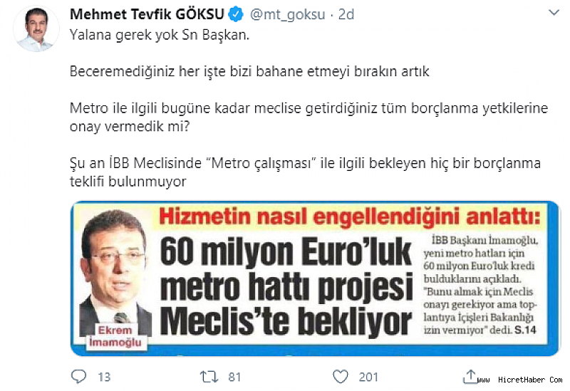 İBB AK Parti Grup Başkanvekili Mehmet Tevfik Göksu, CHP'li İBB Başkanı Ekrem İmamoğlu'nun, metro inşaatı için bulunan kredinin İBB meclisinde bekletildiğine dair iddialarını ''Şu an İBB Meclisinde “Metro çalışması” ile ilgili bekleyen hiç bir borçlanma teklifi bulunmuyor.'' diyerek yalanladı.