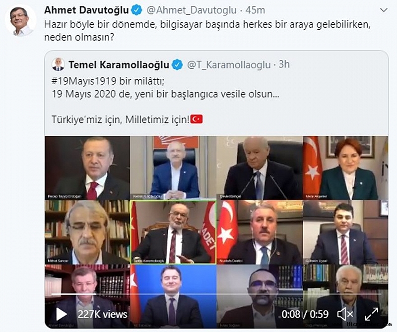 Gelecek Partisi Genel Başkanı Ahmet Davutoğlu, videoyu paylaşarak “Hazır böyle bir dönemde, bilgisayar başında herkes bir araya gelebilirken, neden olmasın?” mesajına yer verdi.