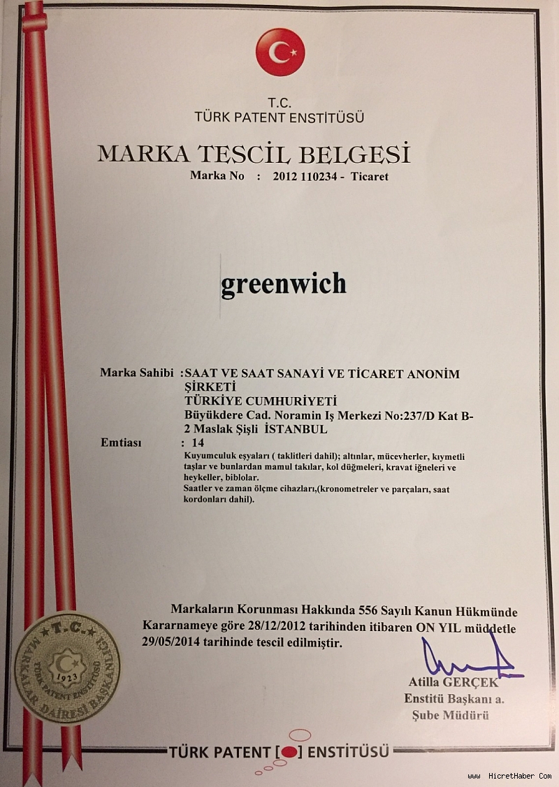 Bahsi geçen firma ile şirketimiz arasında marka hukukundan kaynaklı bir dava mevcuttur. Her iki tarafın da Greenwich markasına dair farklı sınıflarda marka tescil belgesi bulunmaktadır. Şirketimizin Greenwich adına 14.sınıfta saat üretimine ilişkin tescili bulunurken, söz konusu firmanın 35.sınıfta sadece mağaza açma tescili bulunmaktadır. Başka bir ifade ile Greenwich markasına ait saat üretim hakkı, dünyanın diğer ülkelerinde olduğu gibi Türkiye’de de Saat&Saat tarafından tescil ettirilmiştir.