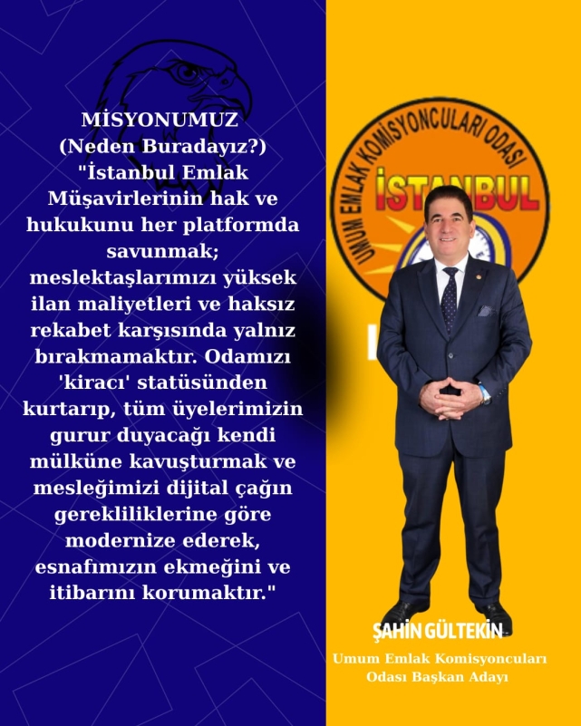 İstanbul Emlak Odası (İEKO) seçimleri yaklaşırken, sektörün deneyimli ve sahadan gelen ismi Şahin Gültekin, güçlü vizyonu, iddialı projeleri ve net söylemleriyle yarışa damgasını vurdu. “Başkalarını ev sahibi yaparken, odamızı da ev sahibi yapmaya geliyoruz” sözleriyle yola çıkan Gültekin, yalnızca bir başkanlık adaylığı değil, İstanbul emlak sektöründe köklü bir zihniyet ve yönetim değişimi vaat ediyor.