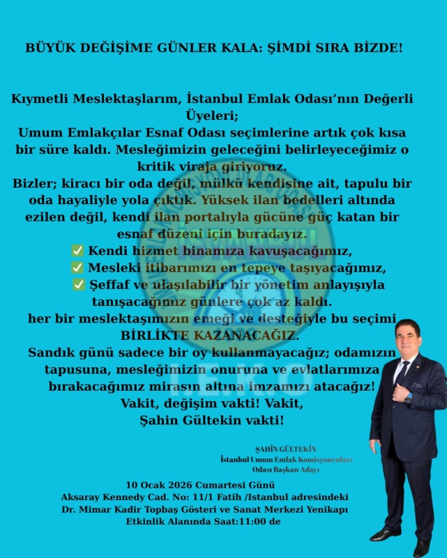 İstanbul Emlak Odası seçimleri, bu sözlerin ve projelerin ışığında sıradan bir yönetim değişikliği değil; mesleğin geleceğini belirleyecek bir yol ayrımı olarak görülüyor. Şahin Gültekin ise bu yol ayrımında, “tapulu bir oda, güçlü bir meslek” iddiasıyla dikkatleri üzerine çekmeye devam ediyor.