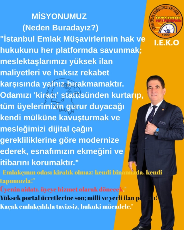 Doğru bütçe yönetimi, şeffaf mali disiplin ve tasarruf odaklı bir anlayışla; içinde eğitim salonları, toplantı alanları ve sosyal donatıların yer aldığı modern bir İstanbul Emlak Odası (İEKO) Hizmet Binası satın alınacak. Bu bina, kişilerin değil; binlerce emlakçının ortak tapusu olacak.