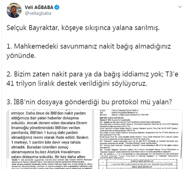 İBB'den T3 Vakfı'na herhangi bir ödeme yapılmadığına ilişkin mahkeme kararına rağmen 'Selçuk Bayraktar, köşeye sıkışınca yalana sarılmış' paylaşımı yapan CHP Genel Başkan yardımcısı ve Malatya Milletvekili Veli Ağbaba'ya Baykar Teknik Müdürü Selçuk Bayraktar'dan sert cevap geldi.