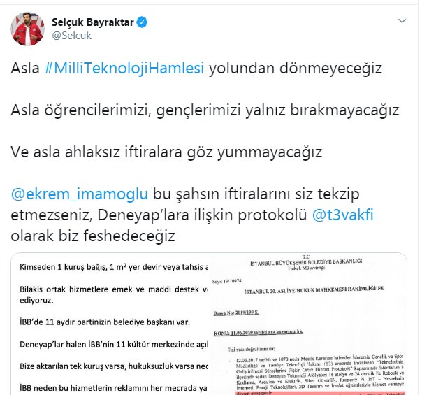 Sosyal medya hesabından belge paylaşarak İBB Başkanı Ekrem İmamoğlu'na çağrıda bulunan Bayraktar, ''Asla Milli Teknoloji hamlesi yolundan dönmeyeceğiz Asla öğrencilerimizi, gençlerimizi yalnız bırakmayacağız. Ve asla ahlaksız iftiralara göz yummayacağız @ekrem_imamoglu bu şahsın iftiralarını siz tekzip etmezseniz, Deneyap’lara ilişkin protokolü @t3vakfi olarak biz feshedeceğiz.'' ifadelerini kullandı.