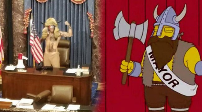 Kongre binasına giren yağmacılardan kürsü çalan adamın fotoğrafı ile dizinin oyuncularından Homer Simpson'ın Oscar ödül töreninden heykel çaldığı sahneden bir karenin oldukça benzemesi dikkatlerden kaçmadı.