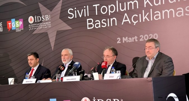 Türkiye Gönüllü Teşekküller Vakfı Başkanı Hamza Akbulut, Milli İrade Platformu adına İnsan ve Medeniyet Hareketi Onursal Başkanı Mehmet Güney, Türkiye Gençlik STK'ları Platformu Başkanı Ömer Faruk Terzi, İslam Dünyası STK'ları Birliği Genel Sekreteri Ali Kurt, Suriye'nin idlib kentinde yaşananlara ilişkin Haliç Kongre Merkezi'nde ortak basın toplantısı düzenledi.