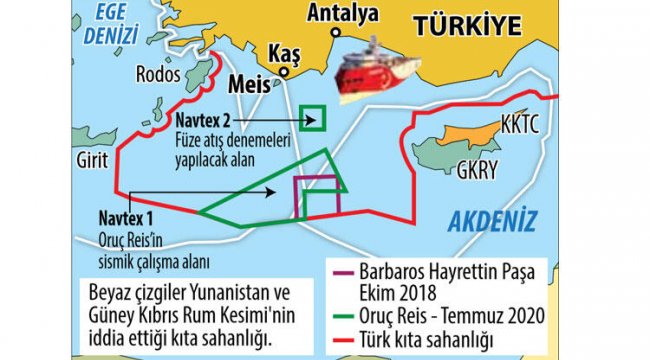 Türkiye’nin, sismik araştırma gemisi Oruç Reis’in Meis Adası’nın güney ve doğusunda araştırma yapacağına ilişkin NAVTEX yayınlamasının ardından Yunanistan, Türkiye’nin NAVTEX ilan ettiği koordinatlarda anti-NAVTEX yayınlamıştı ki Türkiye yeni bir adım attı. Deniz Kuvvetleri, bu kez Antalya Körfezi’nde Meis adasının doğusundaki bölgede füze atışı denemeleri yapılacağının ilan edildiği yeni bir NAVTEX yayınladı.FÜZE DENEMESİNİ RUSLAR YAPACAKAtış testlerinin, 18 Ağustos’ta saat 06.00 -15.00 aralığında, sondaj sahasının hemen altında yapılacağı ilan edildi. Füze atışı denemelerinin Türk gemileri değil Rus donanması tarafından yapılacağı belirtildi. Güvenlik uzmanları, atış denemesinin yapılacağı bölgede NAVTEX ilan yetkisinin Türkiye’de olduğunu, bu nedenle ilanı Türkiye’nin yaptığını anlattı.NAVTEX NEDİR?NAVTEX, denizcilere, meteoroloji tahminleri, seyir bilgileri, aciliyet, emniyet ve denizde çalışma yapılan sahalar hakkında bilgi veren haberleşme cihaz sistemidir. Ülkelerin deniz kuvvetleri, yapacağı eğitim ve tatbikatların bilgisini önceden duyurarak bu sahalara girilmemesi konusunda uyarılarda bulunur.