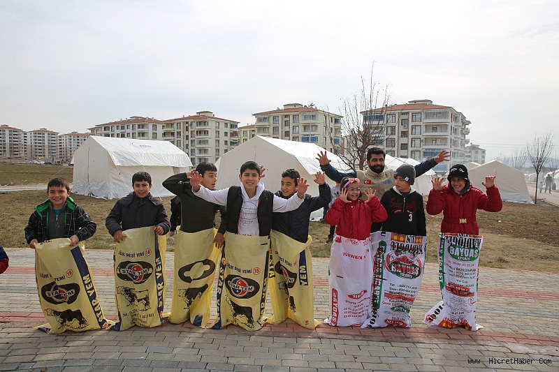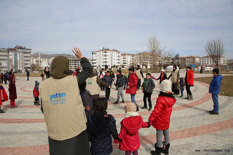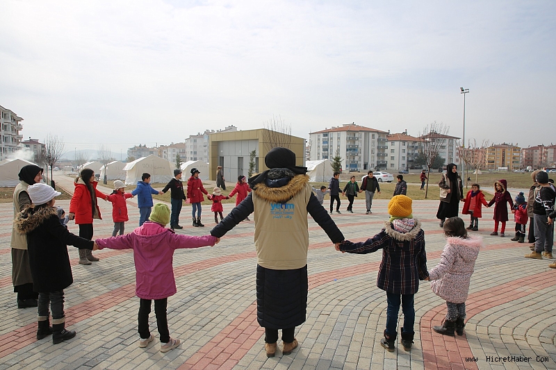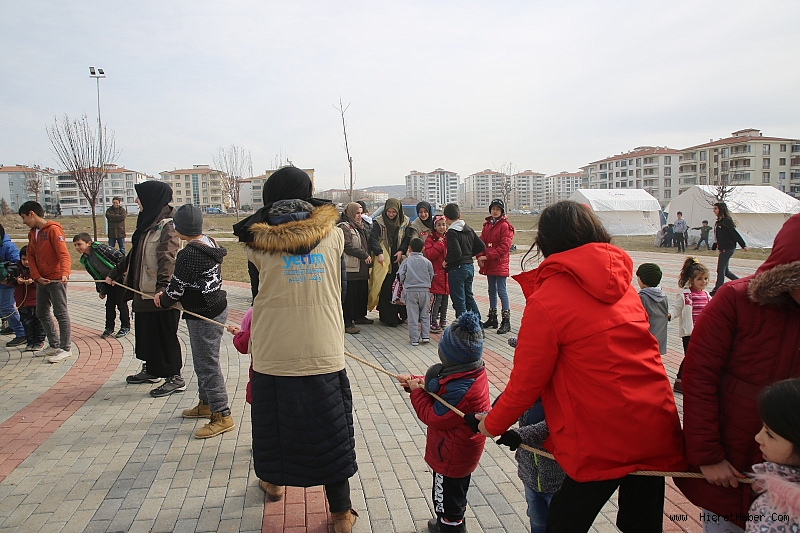 Depremin 4. gününde de çalışmalarını sürdüren yetim vakfı uzman psikolog ekibi, çocukların enerjisini yüksek tutmak amacıyla çocuk etkinliği düzenledi. Yaklaşık 50 çocuğun katıldığı etkinlikte birbirinden renkli oyunlar oynandı. Çuval koşusu, ip çekme, voleybol ve farklı birçok oyunun oynandığı etkinlikte çocuklar doyasıya eğlendi.