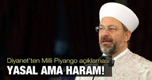 Diyanet İşleri Başkanı Prof. Dr. Ali Erbaş, Din İşleri Yüksek Kurulu tarafından verilen fetvaların zaman zaman medya tarafından tepkiyle karşılanmasının sebebinin din-devlet ilişkilerinde yaşanan ikilemden kaynaklandığını belirterek, "Örneğin, devletin yürürlükte olan sistemi içerisinde yasal olan bir uygulama, dini açıdan caiz olmayabiliyor. Yani haram olabilir. Bir örnek vereyim; faiz meselesi. Yasaldır ama haramdır. Ya da içki, kumar, şans oyunları... Ayetler bu konuda açıktır" dedi. Geçtiğimiz günlerde Diyanet'in 'milli piyango haramdır' fetvası gündem olmuştu. Diyanet İşleri Başkanı Ali Erbaş, 'Avrasya İslam Şurası Fetva Meclisi 2. Toplantısı'nın açılışına katıldı.