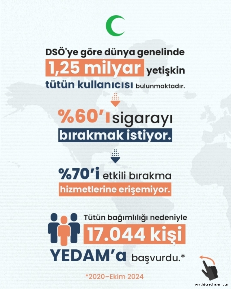 Dünya genelinde 1,25 milyar yetişkin tütün kullanıyor. DSÖ verilerine göre bu kişilerin %60’ı sigarayı bırakmak istiyor, ancak %70’i etkili bırakma hizmetlerine erişemiyor.