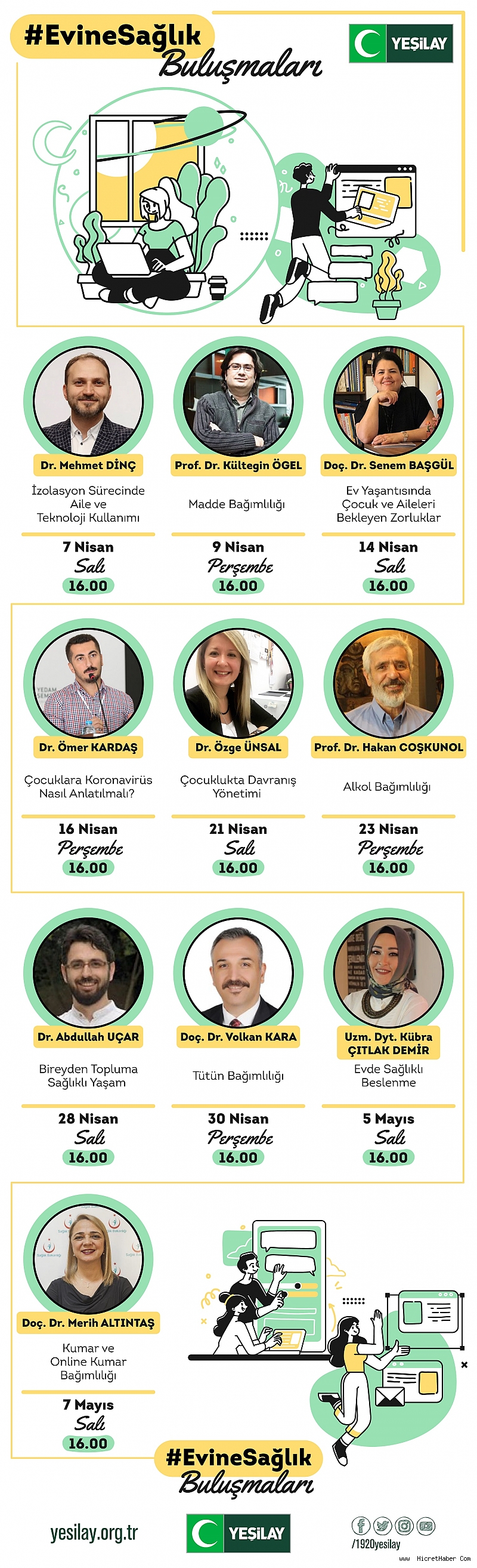 Bağımlılıklarla mücadelede sağlıklı ve iyi yaşamın önemini her fırsatta vurgulayan Yeşilay, koronavirüs (Covid-19) salgın hastalığı döneminde #EvineSağlık Buluşmaları ile evlere konuk olarak hem fiziksel hem de ruhsal sağlığın korunmasına yönelik bilgileri paylaşıyor. Yeşilay, Instagram üzerinden Cansu Canan Özgen’in moderatörlüğünde gerçekleşen canlı yayınlarda alanında uzman isimleri ağırlıyor.