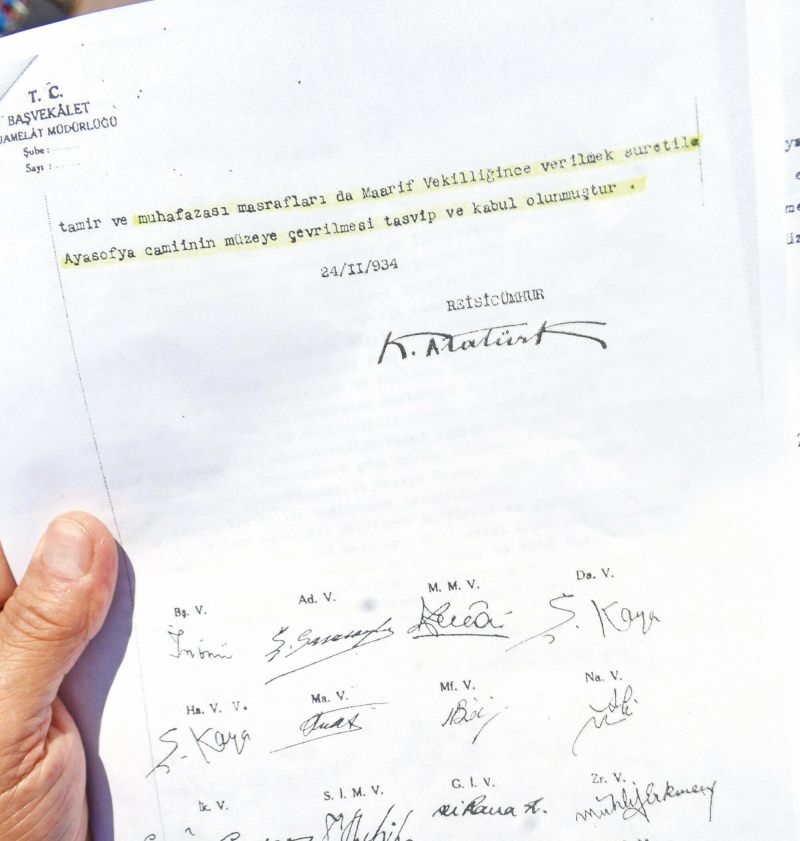 Caminin kapatılması talebini Abidin Özmen’e soruyorlar. "Haddini aşmış bunlar. Biz hem müze hem ibadethane olmasını arzu ediyoruz" diyor. Dönemin İçişleri Bakanı Şükrü Kaya da rapordaki "Ayasofya tümüyle müze yapılmalı" ifadesine Mustafa Kemal’in tepki gösterdiğini ifade ediyor. "Ona sorduğumuzda olamaz böyle bir şey. Bizim hedefimiz böyle bir şey değil" diyor. Atatürk’ün 1935 yılında müzeyi gezdiğini söylüyorlar. Caminin içi değil avlu kısmı müze olarak açılıyor, Atatürk orayı geziyor. Hiçbir haberde binanın içini gezdi demiyor.
