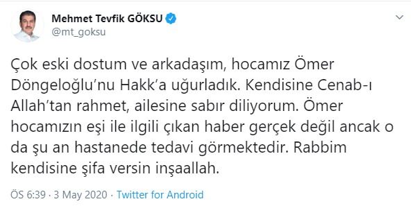 Esenler Belediye Başkanı M. Tevfik Göksu da sosyal medyada yayılan yalanla ilgili sosyal medyadan açıklama yaptı. Göksü açıklamasında "Çok eski dostum ve arkadaşım, hocamız Ömer Döngeloğlu’nu Hakk’a uğurladık. Kendisine Cenab-ı Allah’tan rahmet, ailesine sabır diliyorum. Ömer hocamızın eşi ile ilgili çıkan haber gerçek değil ancak o da şu an hastanede tedavi görmektedir. Rabbim kendisine şifa versin inşaallah." ifadelerini kullandı.
